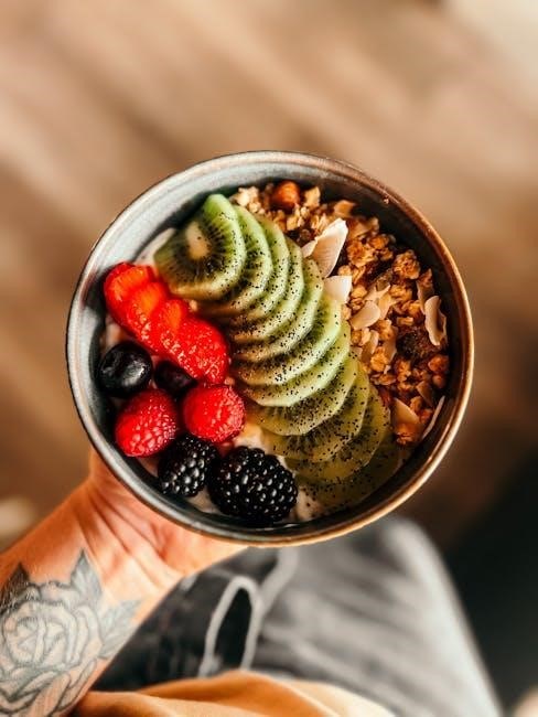 Quinoa and brown rice are excellent whole-grain choices‚ offering fiber and essential nutrients․ Fruits‚ consumed in moderation‚ provide natural sweetness and antioxidants; berries are particularly favored․ Avoiding refined grains‚ sugary drinks‚ and processed foods is crucial․ Prioritizing these carbohydrate sources supports the plan’s emphasis on whole‚ unprocessed foods and optimal metabolic function․